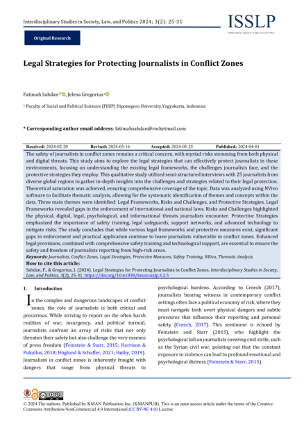 "The safety of journalists in conflict zones remains a critical concern, with myriad risks stemming from both physical and digital threats. This study aims to explore the legal strategies that can effectively protect journalists in these environments, focusing on understanding the existing legal frameworks, the challenges journalists face, and the protective strategies they employ. This qualitative study utilized semi-structured interviews with 25 journalists from diverse global regions to gather in-depth insights into the challenges and strategies related to their legal protection. Theoretical saturation was achieved, ensuring comprehensive coverage of the topic. Data was analyzed using NVivo software to facilitate thematic analysis, allowing for the systematic identification of themes and concepts within the data. Three main themes were identified: Legal Frameworks, Risks and Challenges, and Protective Strategies. Legal Frameworks revealed gaps in the enforcement of international and national laws. Risks and Challenges highlighted the physical, digital, legal, psychological, and informational threats journalists encounter. Protective Strategies emphasized the importance of safety training, legal safeguards, support networks, and advanced technology to mitigate risks. The study concludes that while various legal frameworks and protective measures exist, significant gaps in enforcement and practical application continue to leave journalists vulnerable in conflict zones. Enhanced legal provisions, combined with comprehensive safety training and technological support, are essential to ensure the safety and freedom of journalists reporting from high-risk areas." (Abstract)