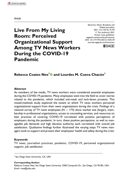 "As members of the media, TV news workers were considered essential employees during the COVID-19 pandemic. Many employees went into the field to cover stories related to the pandemic, which included anti-mask and lock-down protests. This mixed-methods study explored the extent to which TV news workers perceived organizational support from their news organizations during the crisis. Findings of a national survey of TV news employees (N = 173) show market size (larger), membership in professional organizations, access to counseling services, and resources on best practices of covering COVID-19 correlated with positive perceptions of employers during the pandemic. In turn, these positive perceptions, as well as manageable job demands and high decision authority each correlated with overall job satisfaction. Qualitative findings further illustrated the varying steps TV news managers took to support and protect their employees’ health and safety during the crisis." (Abstract)