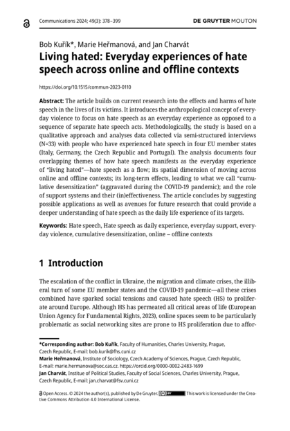 "The article builds on current research into the effects and harms of hate speech in the lives of its victims. It introduces the anthropological concept of everyday violence to focus on hate speech as an everyday experience as opposed to a sequence of separate hate speech acts. Methodologically, the study is based on a qualitative approach and analyses data collected via semi-structured interviews (N=33) with people who have experienced hate speech in four EU member states (Italy, Germany, the Czech Republic and Portugal). The analysis documents four overlapping themes of how hate speech manifests as the everyday experience of “living hated”—hate speech as a flow; its spatial dimension of moving across online and offline contexts; its long-term effects, leading to what we call “cumulative desensitization” (aggravated during the COVID-19 pandemic); and the role of support systems and their (in)effectiveness. The article concludes by suggesting possible applications as well as avenues for future research that could provide a deeper understanding of hate speech as the daily life experience of its targets." (Abstract)