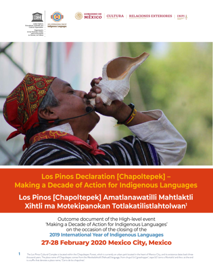 Los Pinos Declaration [Chapoltepek] - Making a Decade of Action for Indigenous Languages: Outcome Document of the High-Level Event 'Making a Decade of Action for Indigenous Languages' on the Occasion of the Closing of the 2019 International Year of Indigenous Languages, 27-28 February 2020 Mexico City, Mexico