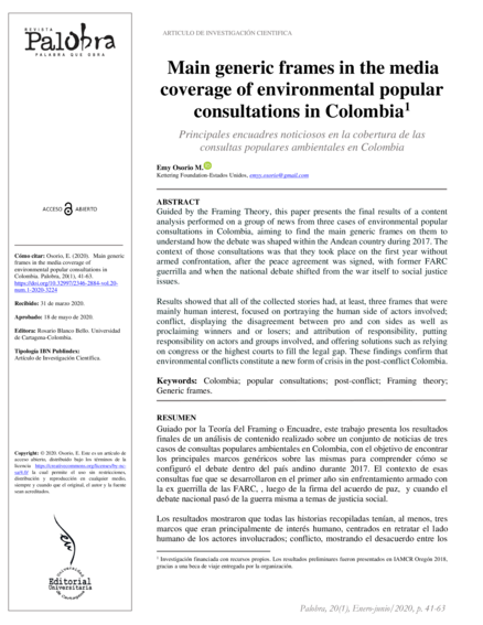 "Guided by the Framing Theory, this paper presents the final results of a content analysis performed on a group of news from three cases of environmental popular consultations in Colombia, aiming to find the main generic frames on them to understand how the debate was shaped within the Andean country during 2017. The context of those consultations was that they took place on the first year without armed confrontation, after the peace agreement was signed, with former FARC guerrilla and when the national debate shifted from the war itself to social justice issues. Results showed that all of the collected stories had, at least, three frames that were mainly human interest, focused on portraying the human side of actors involved; conflict, displaying the disagreement between pro and con sides as well as proclaiming winners and or losers; and attribution of responsibility, putting responsibility on actors and groups involved, and offering solutions such as relying on congress or the highest courts to fill the legal gap. These findings confirm that environmental conflicts constitute a new form of crisis in the post-conflict Colombia." (Abstract)