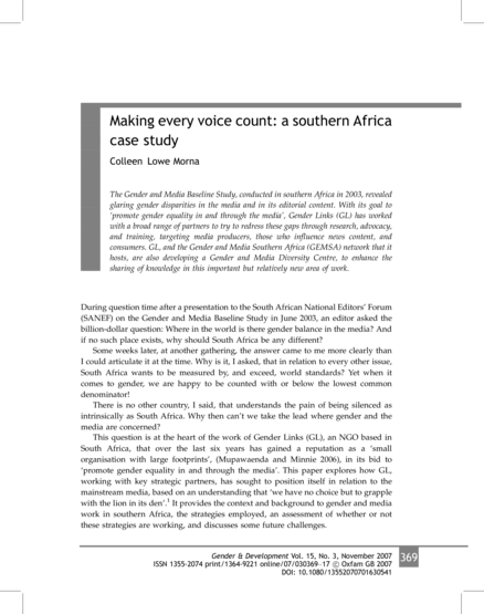"The Gender and Media Baseline Study, conducted in southern Africa in 2003, revealed glaring gender disparities in the media and in its editorial content. With its goal to ‘promote gender equality in and through the media’, Gender Links (GL) has worked with a broad range of partners to try to redress these gaps through research, advocacy, and training, targeting media producers, those who influence news content, and consumers. GL, and the Gender and Media Southern Africa (GEMSA) network that it hosts, are also developing a Gender and Media Diversity Centre, to enhance the sharing of knowledge in this important but relatively new area of work." (Abstract)