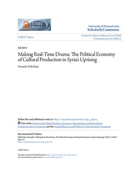 "In CARGC Paper 2, Della Ratta explored how one 2013 Syrian television serial, Wilada min al-Khasira [Birth from the Waist] responded in real time to unfolding events of the Syrian revolution. She argued that the serial offers a living site for scholarly reflection on how cultural production and the power relations that shape it might shift, recombine, and adapt in the context of the three-year-old uprising turned into an armed conflict. Della Ratta mobilized the television serial to explore how the geopolitical relationships between Syrian and Gulf political elites had been dramatically reconfigured." (Description)