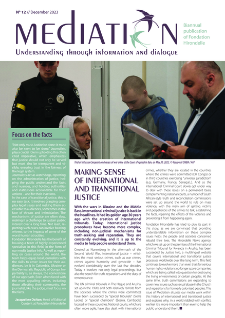 "With the wars in Ukraine and the Middle East, international criminal justice is back in the headlines. It had its golden age 30 years ago with the creation of international tribunals. Today, international justice procedures have become more complex, including non-judicial mechanisms for truth-seeking and reparation. They are constantly evolving, and it is up to the media to help people understand them." (Page 1)