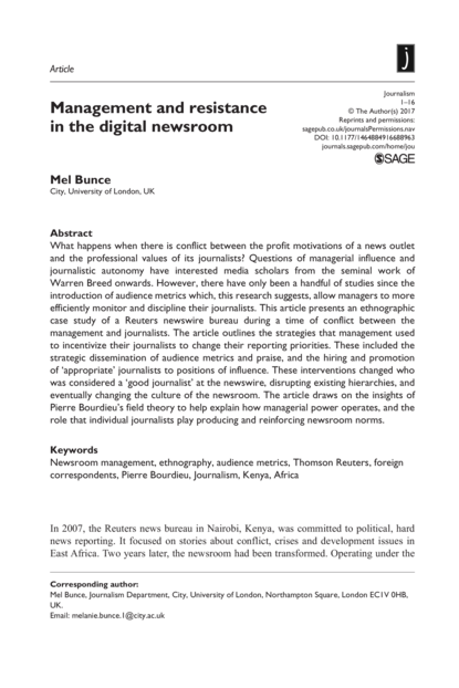 "What happens when there is conflict between the profit motivations of a news outlet and the professional values of its journalists? Questions of managerial influence and journalistic autonomy have interested media scholars from the seminal work of Warren Breed onwards. However, there have only been a handful of studies since the introduction of audience metrics which, this research suggests, allow managers to more efficiently monitor and discipline their journalists. This article presents an ethnographic case study of a Reuters newswire bureau during a time of conflict between the management and journalists. The article outlines the strategies that management used to incentivize their journalists to change their reporting priorities. These included the strategic dissemination of audience metrics and praise, and the hiring and promotion of ‘appropriate’ journalists to positions of influence. These interventions changed who was considered a ‘good journalist’ at the newswire, disrupting existing hierarchies, and eventually changing the culture of the newsroom. The article draws on the insights of Pierre Bourdieu’s field theory to help explain how managerial power operates, and the role that individual journalists play producing and reinforcing newsroom norms." (Abstract)