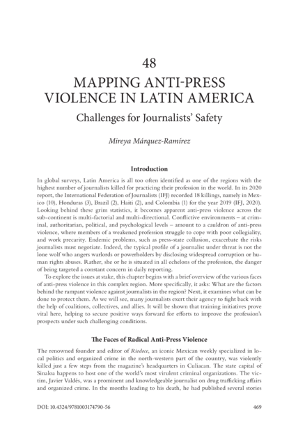 "In global surveys, Latin America is all too often identified as one of the regions with the highest number of journalists killed for practicing their profession in the world. To explore the issues at stake, this chapter begins with a brief overview of the various faces of anti-press violence in this complex region. More specifically, it asks: What are the factors behind the rampant violence against journalists in the region? Next, the chapter examines what can be done to protect them. Brazilian society learned of the lack of safety precautions journalists took on assignment and media houses’ little protection to their staff. Many journalists exert their agency to fight back with the help of coalitions, collectives, and allies. The chapter shows that training initiatives prove vital here, helping to secure positive ways forward for efforts to improve the profession’s prospects under such challenging conditions." (Abstract)