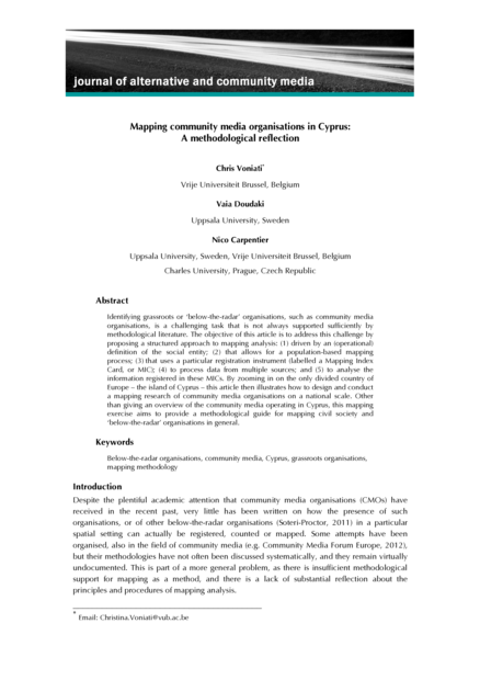"Identifying grassroots or ‘below-the-radar’ organisations, such as community media organisations, is a challenging task that is not always supported sufficiently by methodological literature. The objective of this article is to address this challenge by proposing a structured approach to mapping analysis: (1) driven by an (operational) definition of the social entity; (2) that allows for a population-based mapping process; (3) that uses a particular registration instrument (labelled a Mapping Index Card, or MIC); (4) to process data from multiple sources; and (5) to analyse the information registered in these MICs. By zooming in on the only divided country of Europe – the island of Cyprus – this article then illustrates how to design and conduct a mapping research of community media organisations on a national scale. Other than giving an overview of the community media operating in Cyprus, this mapping exercise aims to provide a methodological guide for mapping civil society and ‘below-the-radar’ organisations in general." (Abstract)