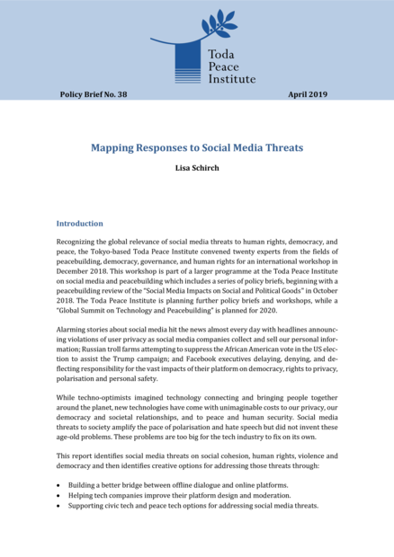 "This report identifies social media threats - surveillance, addiction, disinformation, polarisation, dangerous speech - on social cohesion, human rights, violence and democracy and then identifies creative options for addressing those threats through: building a better bridge between offline dialogue and online platforms; helping tech companies improve their platform design and moderation; supporting civic tech and peace tech options for addressing social media threats; mobilizing civil society to develop campaigns to address social media threats directly or through leveraging pressure on tech companies and governments; leveraging financial and legal pressure on tech companies; recognizing the education and research necessary to develop better long-term solutions." (Introduction, pages 1-2)