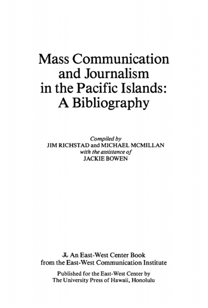 "The compilers point out that little attention has been paid to mass communication in most Pacific islands, and their research proves them correct. There is one citation each for Easter Island and Midway Island. Hawaii has almost 2,000. This Center for Cultural and Technical Interchange Between East and West bibliography contains citations to 3,332 books, periodicals, articles, documents, and pamphlets, and covers the years 1854-1975, with some entries from 1976. Topics include the press, newspapers, freedom of the press, broadcasting, news agencies, organizations, radio broadcasting, cinema, and television in the Pacific Islands. Entries are arranged alphabetically by more than 20 island groupings and broken down into specific subject areas, rumbered, and arranged chronologically within those subjects. Richstad also produced The Pacific Islands Press: A Directory (East-West Communication Institute, 1973)." (Jo A. Cates: Journalism - a guide to the reference literature. Englewood, Col.: Libraries Unlimited, 2nd ed. 1997 nr. 99)
