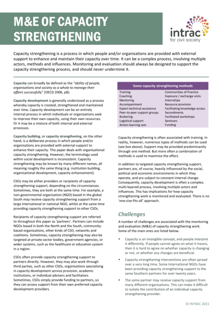 "Capacity strengthening is a process in which people and/or organisations are provided with external support to enhance and maintain their capacity over time. It can be a complex process, involving multiple actors, methods and influences. Monitoring and evaluation should always be designed to support the capacity strengthening process, and should never undermine it." (Page 1)