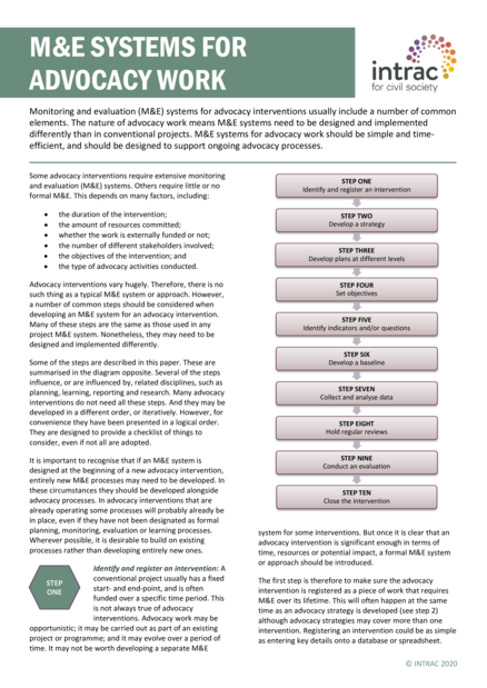 "Monitoring and evaluation (M&E) systems for advocacy interventions usually include a number of common elements. The nature of advocacy work means M&E systems need to be designed and implemented differently than in conventional projects. M&E systems for advocacy work should be simple and time-efficient, and should be designed to support ongoing advocacy processes." (Introduction)