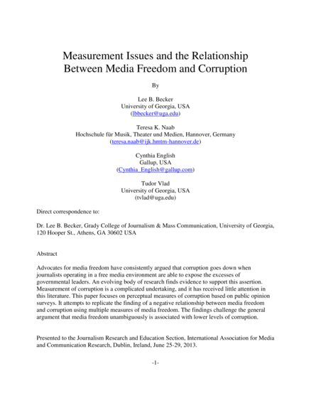 "Advocates for media freedom have consistently argued that corruption goes down when journalists operating in a free media environment are able to expose the excesses of governmental leaders. An evolving body of research finds evidence to support this assertion. Measurement of corruption is a complicated undertaking, and it has received little attention in this literature. This paper focuses on perceptual measures of corruption based on public opinion surveys. It attempts to replicate the finding of a negative relationship between media freedom and corruption using multiple measures of media freedom. The findings challenge the general argument that media freedom unambiguously is associated with lower levels of corruption." (Abstract)