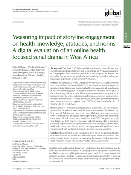 "Cest la Vie!" (CLV) is a serial drama that entertains, educates, and promotes positive health behaviors and social change for West African audiences. The purpose of this study was to evaluate if watching the CLV Season 2 series online had an impact on people’s health knowledge, attitudes, and norms, focusing on populations in francophone West Africa. Between July 2019 and October 2019, viewers of CLV and non-viewers were recruited from Facebook and YouTube. We conducted an online longitudinal cohort study that assessed changes in health knowledge, attitudes, and norms (KAN) between these groups. Participants completed a baseline survey prior to the online airing and up to three follow-up surveys corresponding to specific health stories in the series, including sexual violence, emergency contraception, and female circumcision. We used descriptive statistics to describe viewers and non-viewers, and an item response theory (IRT) analysis to identify the effect of viewing CLV on overall KAN. A total of 1674 respondents participated in the study. One in four participants had seen one of the three storylines from CLV Season 2 (ie, CLV viewers). At follow-up, viewers were more likely than non-viewers to know when to correctly use emergency contraception and to believe that the practice of female circumcision should end. Compared to people who did not see CLV, viewers of the series had 26% greater odds of answering pro-health responses at follow-up about sexual assault, emergency contraception, and female circumcision. Further, the level of engagement with specific storylines was associated with a differential impact on overall outcome questions." (Abstract)