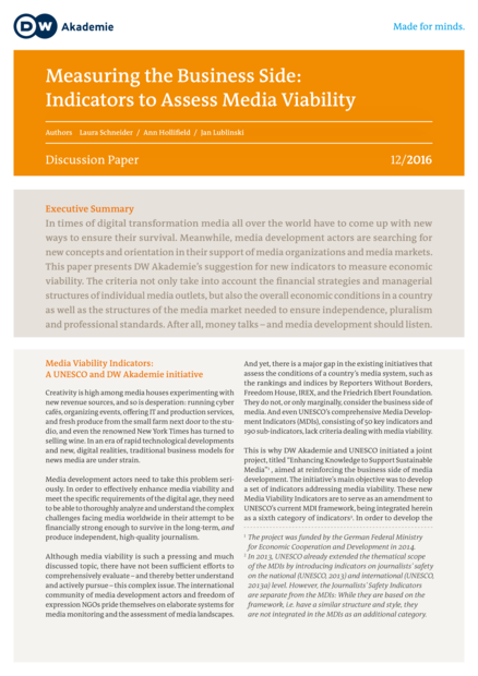 "In times of digital transformation media all over the world have to come up with new ways to ensure their survival. Meanwhile, media development actors are searching for new concepts and orientation in their support of media organizations and media markets. This paper presents DW Akademie’s suggestion for new indicators to measure economic viability. The criteria not only take into account the financial strategies and managerial structures of individual media outlets, but also the overall economic conditions in a country as well as the structures of the media market needed to ensure independence, pluralism and professional standards. After all, money talks – and media development should listen." (Executive summary)
