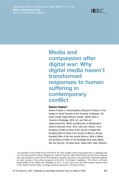 "In this article I contend that the saturation of information and images of human suffering and death in contemporary warfare has not ushered in a new era of “compassion fatigue”. Rather, algorithmically charged outrage is a proxy for effects. It is easy to misconstrue the velocity of linking and liking and sharing as some kind of mass action or mass movement. Humanitarian catastrophes slowly unfold in an age of continuous and connective digital glare, and yet they are unseen. If the imploded battlefield of digital war affording the most proximate and persistent view of human suffering and death in history cannot ultimately mobilize radically effective forms of public response, it is difficult to imagine what will." (Abstract)