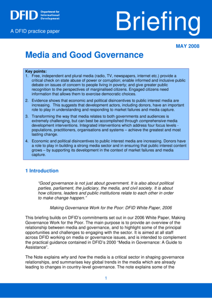 "This briefing builds on DFID’s commitments set out in our 2006 White Paper, Making Governance Work for the Poor. The main purpose is to provide an overview of the relationship between media and governance, and to highlight some of the principal opportunities and challenges to engaging with the sector. It is aimed at all staff across DFID working on media or governance issues, and is intended to complement the practical guidance contained in DFID’s 2000 “Media in Governance: A Guide to Assistance”. The Note explains why and how the media is a critical sector in shaping governance relationships, and summarises key global trends in the media which are already leading to changes in country-level governance. The note explains some of the incentives and disincentives driving the sector which can lead the media to play either a positive or negative role in strengthening democratic politics. It pays particular attention to the role of the media in fragile states. The paper concludes by identifying key lessons and principles for donors to increase the effectiveness of media development initiatives in order to help build democratic, capable, accountable and responsive states." (Introduction, pages 1-2)