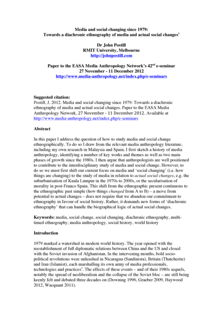 "In this paper I address the question of how to study media and social change ethnographically. To do so I draw from the relevant media anthropology literature, including my own research in Malaysia and Spain. I first sketch a history of media anthropology, identifying a number of key works and themes as well as two main phases of growth since the 1980s. I then argue that anthropologists are well positioned to contribute to the interdisciplinary study of media and social change. However, to do so we must first shift our current focus on media and ‘social changing’ (i.e. how things are changing) to the study of media in relation to actual social changes, e.g. the suburbanisation of Kuala Lumpur in the 1970s to 2000s, or the secularisation of morality in post-Franco Spain. This shift from the ethnographic present continuous to the ethnographic past simple (how things changed from A to B) – a move from potential to actual changes – does not require that we abandon our commitment to ethnography in favour of social history. Rather, it demands new forms of ‘diachronic ethnography’ that can handle the biographical logic of actual social changes." (Abstract)