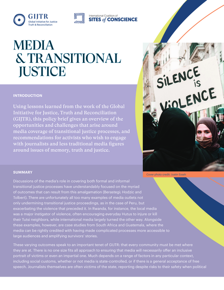 "Using lessons learned from the work of the Global Initiative for Justice, Truth and Reconciliation (GIJTR), this policy brief gives an overview of the opportunities and challenges that arise around media coverage of transitional justice processes, and recommendations for activists who wish to engage with journalists and less traditional media figures around issues of memory, truth and justice." (Introduction)