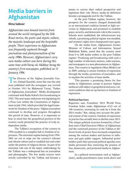 "Afghanistan once housed tourists from around the world intrigued by the Silk Road stories, the poetic and mystic culture, the majestic landscape and the hospitable people. Their experience in Afghanistan was frequently captured through journalism and photojournalism of the early 1900s. However, Afghanistan’s very own media culture was born during this same time with Seraj-ul-Akhbar being the country’s first newspaper, published on 11 January 1906." (Abstract)
