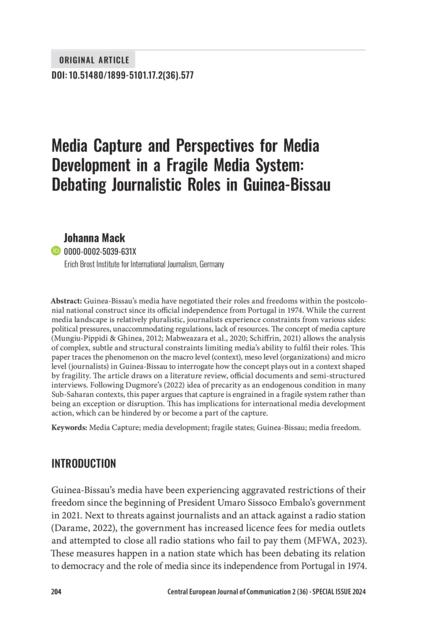 "Guinea-Bissau's media have negotiated their roles and freedoms within the postcolonial national construct since its official independence from Portugal in 1974. While the current media landscape is relatively pluralistic, journalists experience constraints from various sides: political pressures, unaccommodating regulations, lack of resources. The concept of media capture (Mungiu-Pippidi & Ghinea, 2012; Mabweazara et al., 2020; Schiffrin, 2021) allows the analysis of complex, subtle and structural constraints limiting media's ability to fulfil their roles. This paper traces the phenomenon on the macro level (context), meso level (organizations) and micro level (journalists) in Guinea-Bissau to interrogate how the concept plays out in a context shaped by fragility. The article draws on a literature review, official documents and semi-structured interviews. Following Dugmore's (2022) idea of precarity as an endogenous condition in many Sub-Saharan contexts, this paper argues that capture is engrained in a fragile system rather than being an exception or disruption. This has implications for international media development action, which can be hindered by or become a part of the capture." (Abstract)