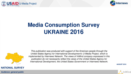 "The Internews annual media consumption survey shows more Ukrainians searching for news online and fewer getting their news from television. Trust in Ukrainian online media is also up, matching the trend in greater consumption. The survey also shows that Ukrainians are consuming Russian media far less than they did last year, and that trust in Russian media continues to decline." (Internews website)