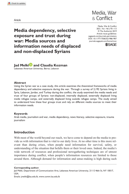 "Using the Syrian war as a case study, this article examines the theoretical frameworks of media dependency and selective exposure during the war. Through a survey of 2,192 Syrians living in Syria, Lebanon, Jordan, and Turkey during the conflict, the study examined the media needs and trust of four groups of Syrians: non-displaced, internally displaced, externally displaced living inside refugee camps, and externally displaced living outside refugee camps. The study aimed to understand how these four groups trust and rely on different media sources to meet their information needs." (Abstract)