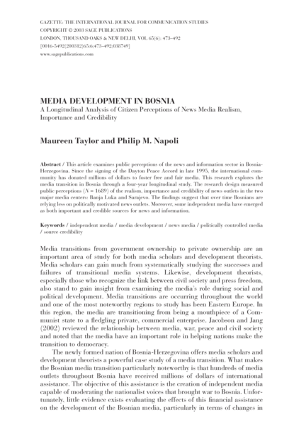 "This article examines public perceptions of the news and information sector in Bosnia-Herzegovina. Since the signing of the Dayton Peace Accord in late 1995, the international community has donated millions of dollars to foster free and fair media. This research explores the media transition in Bosnia through a four-year longitudinal study. The research design measured public perceptions (N = 1689) of the realism, importance and credibility of news outlets in the two major media centers: Banja Luka and Sarajevo. The findings suggest that over time Bosnians are relying less on politically motivated news outlets. Moreover, some independent media have emerged as both important and credible sources for news and information." (Abstract)