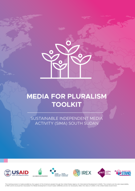 "Sustainable Independent Media Activity (SIMA) partners the Aga Khan Foundation (AKF) and the Global Centre for Pluralism (the Centre) have developed this toolkit to support media actors in South Sudan. The purpose of this toolkit is to provide media actors with a set of analytical concepts, practical tools and frameworks to support their role in promoting a more inclusive and peaceful society. By applying pluralism concepts and tools to their work, journalists can promote respect for diversity by facilitating dialogue and understanding and by contributing to social cohesion in fragile and post-conflict contexts, such as South Sudan. This toolkit aims to empower media practitioners in their important role in supporting peacebuilding. The toolkit covers comprehensive content to support media practitioners with the necessary knowledge and tools to identify and discuss issues of inclusion and exclusion in a conflict-sensitive approach. The curriculum will help media actors, including the Association for Media Development in South Sudan (AMDISS) and other SIMA partners, to adopt long-term practices to integrate pluralism into their day-to-day work to support unbiased, accurate and fair content development while reducing discriminatory and divisive narratives that contribute to exclusionary attitudes." (Introduction)