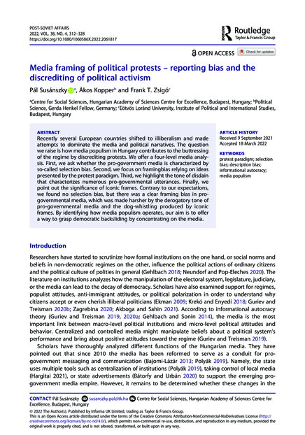 "Recently several European countries shifted to illiberalism and made attempts to dominate the media and political narratives. The question we raise is how media populism in Hungary contributes to the buttressing of the regime by discrediting protests. We offer a four-level media analysis. First, we ask whether the pro-government media is characterized by so-called selection bias. Second, we focus on framing bias relying on ideas presented by the protest paradigm. Third, we highlight the tone of disdain that characterizes numerous pro-governmental utterances. Finally, we point out the significance of iconic frames. Contrary to our expectations, we found no selection bias, but there was a clear framing bias in progovernmental media, which was made harsher by the derogatory tone of pro-governmental media and the dog-whistling produced by iconic frames. By identifying how media populism operates, our aim is to offer a way to grasp democratic backsliding by concentrating on the media." (Abstract)