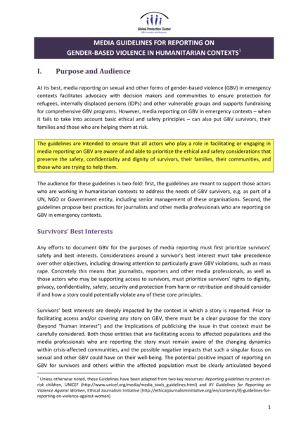 "The guidelines are intended to ensure that all actors who play a role in facilitating or engaging in media reporting on gender-based violence (GBV) are aware of and able to prioritize the ethical and safety considerations that preserve the safety, confidentiality and dignity of survivors, their families, their communities, and those who are trying to help them. The audience for these guidelines is two-fold: first, the guidelines are meant to support those actors who are working in humanitarian contexts to address the needs of GBV survivors, e.g. as part of a UN, NGO or Government entity, including senior management of these organisations. Second, the guidelines propose best practices for journalists and other media professionals who are reporting on GBV in emergency contexts." (Page 1)