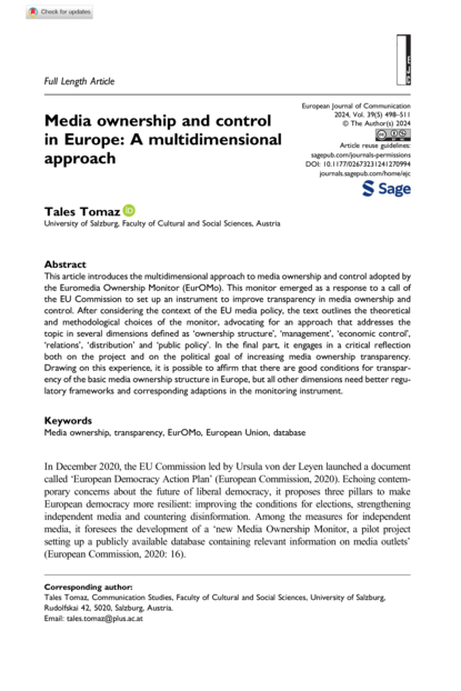 "This article introduces the multidimensional approach to media ownership and control adopted by the Euromedia Ownership Monitor (EurOMo). This monitor emerged as a response to a call of the EU Commission to set up an instrument to improve transparency in media ownership and control. After considering the context of the EU media policy, the text outlines the theoretical and methodological choices of the monitor, advocating for an approach that addresses the topic in several dimensions defined as ‘ownership structure’, ‘management’, ‘economic control’, ‘relations’, ‘distribution’ and ‘public policy’. In the final part, it engages in a critical reflection both on the project and on the political goal of increasing media ownership transparency. Drawing on this experience, it is possible to affirm that there are good conditions for transparency of the basic media ownership structure in Europe, but all other dimensions need better regulatory frameworks and corresponding adaptions in the monitoring instrument." (Abstract)