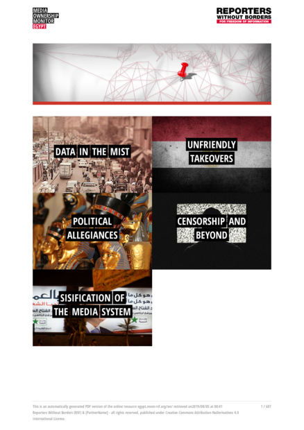 "A hostile takeover of Egypt’s media is under way, leaving the influence on public opinion to be controlled by the state, the secret services and a few wealthy owners loyal to the regime and with close ties to the former president Hosni Mubarak. In a move to gain influence over the State-owned media, the media giant Egyptian Media group signed several deals with the National Media authority on 20 January 2019 extending its control and increasing the influence of the General Intelligence over the Egyptian media landscape. The coordinated attack on media freedom and pluralism is facilitated by a set of new laws restructuring the media sector in 2018 and by the ongoing pressure on journalists and media workers by the state." (http://www.mom-rsf.org/en/countries/egypt)