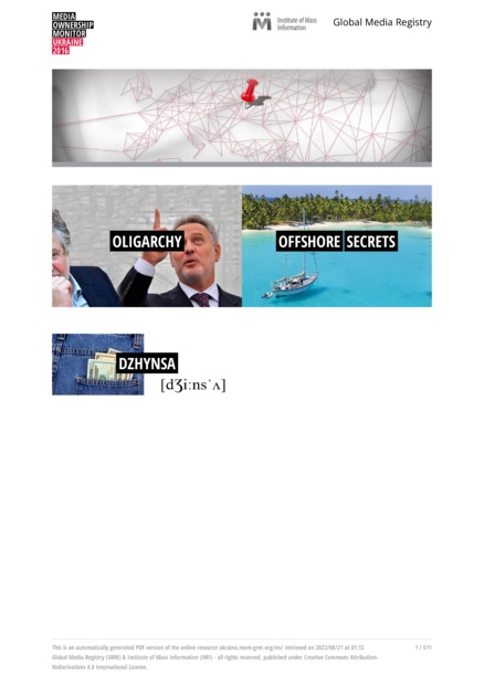 "Ukrainian mass media outlets are mostly driven by their owners’ individual interests and thus serve as instruments to securing political and economic power. Corruption and lack of financial transparency further inhibit the healthiness of the country’s media landscape. The Media Ownership Monitor Ukraine, carried out from July to October 2016 together with the Institute of Mass Information (IMI), showed that the Ukraine media is prone to power plays, more than ever. The Media Ownership Monitor pinpoints that concentration is especially high within the audio-visual and radio markets. The major four TV owners – StarLight Media, 1+1 Media, Inter Media and Media Group Ukraine – represent an audience share of more than three quarters. The top four radio groups even combine a reach of 92% of the audience in Ukraine: Tavr Radio Group, Ukrainian Media Holding, Business Radio Group and TRK Lux. Those media groups mainly belong to some of the richest in Ukraine, amongst others Viktor Pinchuk, Ihor Kolomoyskyi, Dmytro Firtash and Rinat Akhmetov. The print media and online sectors are less concentrated. Online media in particular offer much more pluralism and choice to Internet savvy Ukrainians." (http://www.mom-rsf.org)
