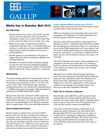 "Bamako adults are avid news users; 92.5% say they receive news from television, radio, the Internet or newspapers at least once a week; 78.4% report they receive news from these sources at least once a day. Mobile phone, radio, and television ownership is widespread in Bamako. Nine in 10 Bamako adults say they have a mobile phone in their household, 86.6% report owning a radio, and 83.8% say they have a working television. Bamako adults are most interested in the topics of religion (93.1%), health and healthcare (89.8%), and education (89.0%). Bambara is the preferred radio broadcast language. It is also the most commonly understood language (99.3%), and the language the majority of those adults (99.4%) report they would understand in a newscast." (Page 1)
