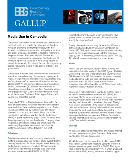 "A majority (57%) of Cambodians say they watch TV news at least weekly, with urban residents considerably more likely than their rural counterparts to do so. Radio follows, used for news by 42,9% overall and equally prevalent in urban and rural areas. About one in 10 Cambodians overall now say they turn to the internet (9,4%) or social networking sites (10,8%) for news, with those figures rising to more than two in 10 among urban residents." (Page 1)