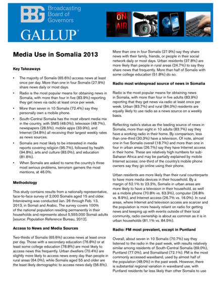 "The majority of Somalis (65.6%) access news at least once per day. More than one in four Somalis (27.9%) share news daily or most days. Radio is the most popular means for obtaining news in Somalia, with more than four in five (83.9%) reporting they get news via radio at least once per week. More than seven in 10 Somalis (72.4%) say they personally own a mobile phone." (Page 1)