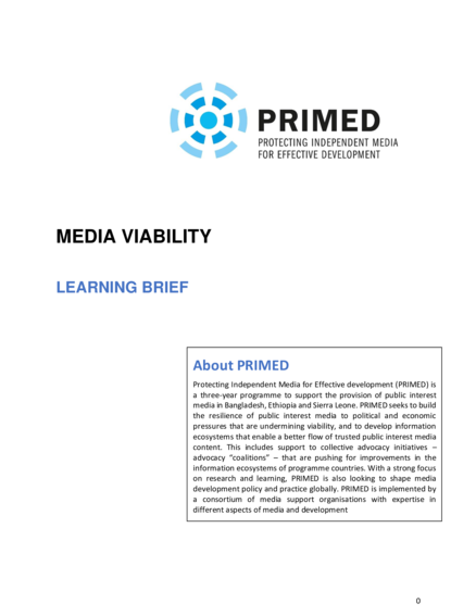 "[...] there was no single approach to measuring media viability. Deutsche Welle Akademie's (DWA) Media Viability Indicators are designed to assess viability on three levels, considering the overall economic environment (macro); the structure of the media market and potential sources of revenue (meso); and the resources and structures of media organisations operating in that market (micro). Conversely, Media Development Investment Fund (MDIF) seeks to promote the long-term financial well-being of individual media outlets. Its metrics are composed of seven company-specific indicators that are built using data from client business records. PRIMED will seek to measure viability at the ecosystem level as well as at the institutional level. It will examine the extent to which media partners become more resilient to environmental shocks and stresses by improving their management systems and adopting new business practices. The programme will analyse their organisational performance against a resilience index which includes their ability to deliver inclusive and relevant public interest content." (Page 2)