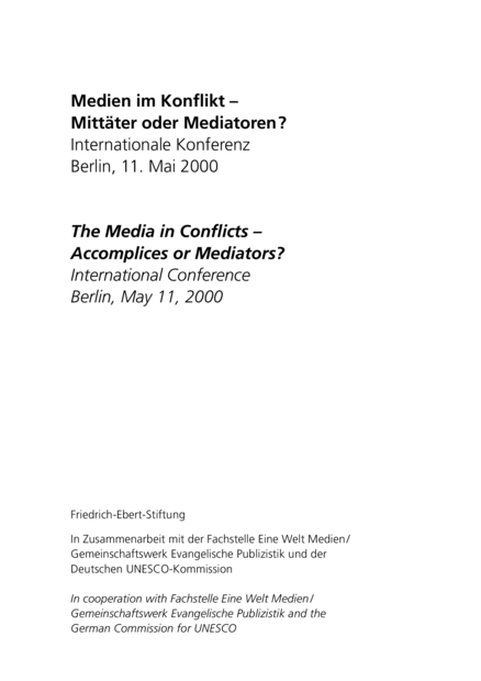 Medien im Konflikt: Mittäter oder Mediatoren? Internationale Konferenz Berlin, 11. Mai 2000 = The Media in Conflicts: Accomplices or Mediators? International Conference Berlin, May 11, 2000