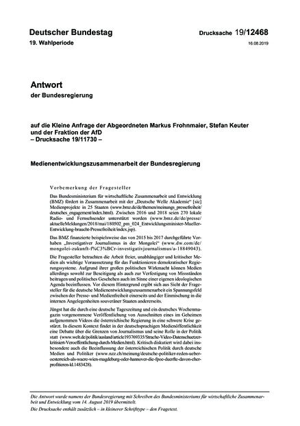 Medienentwicklungszusammenarbeit der Bundesregierung: Antwort der Bundesregierung auf die Kleine Anfrage der Abgeordneten Markus Frohnmaier, Stefan Keuter und der Fraktion der AfD – Drucksache 19/11730