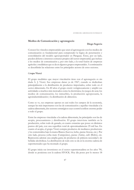 "Conocer los vínculos empresariales que unen al agronegocio con los medios de comunicación es fundamental para comprender la lógica de penetración y consolidación del modelo agroexportador en Paraguay. Éstos, por un lado, pueden deberse a intereses comunes propios del sector empresarial, que incluye a los medios de comunicación y, por otro lado, a la total fusión de empresas agrícolas y mediáticas que se da en algunos grupos empresariales. A continuación se describirán las relaciones entre los principales actores de estos sectores." (Página 87)