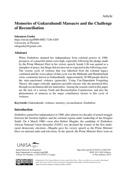 "When Zimbabwe attained her independence from colonial powers in 1980, prospects of a peaceful nation were high, especially following the pledge made by the Prime Minister Elect in his victory speech. Isaiah 2:4b was quoted as a metaphor of peace, but things did not turn out as expected in the following years. The vicious cycle of violence that was inherited from the colonial legacy continued and the worse phase of that cycle was the Midlands and Matabeleland crisis, commonly known as Gukurahundi. Approximately 20 000 people died in the state-sanctioned violence (genocide). Using Cue-Dependent Forgetting Theory, this paper critically appraises possible reasons why the promised bliss through reconciliation did not materialise. Among the reasons cited in this paper are the lack of a serious Truth and Reconciliation Commission, and also the phenomenon of amnesia as the major contributory factors to this cycle of violence." (Abstract)