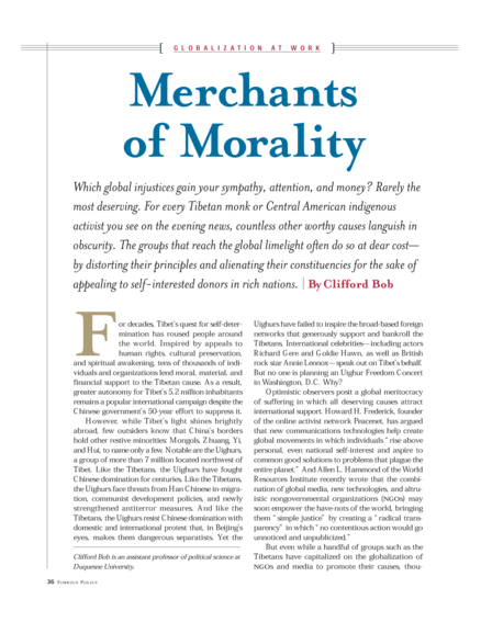 "Which global injustices gain your sympathy, attention, and money? Rarely the most deserving. For every Tibetan monk or Central American indigenous activist you see on the evening news, countless other worthy causes languish in obscurity. The groups that reach the global limelight often do so at dear cost—by distorting their principles and alienating their constituencies for the sake of appealing to self-interested donors in rich nations." (Abstract)