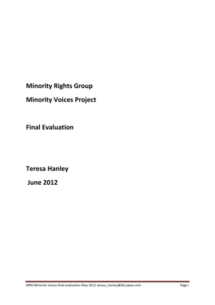 "Minority Voices began in January 2009 and ran for three years. It implemented the vast majority of its planned activities and produced the planned outputs. These include the development of an online hub or newsroom, 11 training workshops, production of reports and briefing materials on minority and indigenous people's issues and a conference in the EU to bring together minority and indigenous people with journalists and policy makers. The project had ten target EU countries: Czeck Republic, France, Germany, Hungary, Ireland, Netherlands, Poland, Spain, Sweden and the UK. The project achieved significant results in terms of the quality of the outputs produced and in the benefits identified by trainees including their increased confidence and skills in engaging with the media. These were subsequently applied notably with their local media. The project also built awareness of and opportunities for journalists in new EU member states to report minority and indigenous communities' issues in development. The flexible approach taken by MRG, learning from experience and adapting to maximise new opportunities contributed significantly to these results." (Executive summary, page ii)