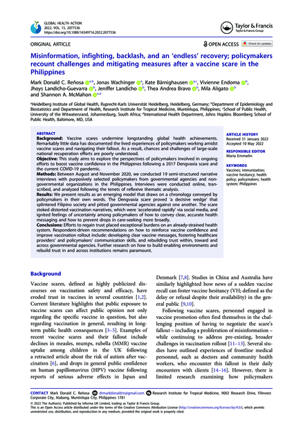 "This study aims to explore the perspectives of policymakers involved in ongoing efforts to boost vaccine confidence in the Philippines following a 2017 Dengvaxia scare and the current COVID-19 pandemic. Between August and November 2020, we conducted 19 semi-structured narrative interviews with purposively selected policymakers from governmental agencies and nongovernmental organizations in the Philippines. Interviews were conducted online, transcribed, and analyzed following the tenets of reflexive thematic analysis. We present results as an emerging model that draws on a chronology conveyed by policymakers in their own words. The Dengvaxia scare proved ‘a decisive wedge’ that splintered Filipino society and pitted governmental agencies against one another. The scare stoked distorted vaccination narratives, which were ‘accelerated rapidly’ via social media, and ignited feelings of uncertainty among policymakers of how to convey clear, accurate health messaging and how to prevent drops in care-seeking more broadly." (Abstract)