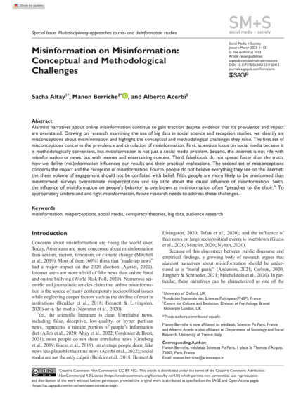 "Alarmist narratives about online misinformation continue to gain traction despite evidence that its prevalence and impact are overstated. Drawing on research examining the use of big data in social science and reception studies, we identify six misconceptions about misinformation and highlight the conceptual and methodological challenges they raise. The first set of misconceptions concerns the prevalence and circulation of misinformation. First, scientists focus on social media because it is methodologically convenient, but misinformation is not just a social media problem. Second, the internet is not rife with misinformation or news, but with memes and entertaining content. Third, falsehoods do not spread faster than the truth; how we define (mis)information influences our results and their practical implications. The second set of misconceptions concerns the impact and the reception of misinformation. Fourth, people do not believe everything they see on the internet: the sheer volume of engagement should not be conflated with belief. Fifth, people are more likely to be uninformed than misinformed; surveys overestimate misperceptions and say little about the causal influence of misinformation. Sixth, the influence of misinformation on people’s behavior is overblown as misinformation often “preaches to the choir.” To appropriately understand and fight misinformation, future research needs to address these challenges." (Abstract)