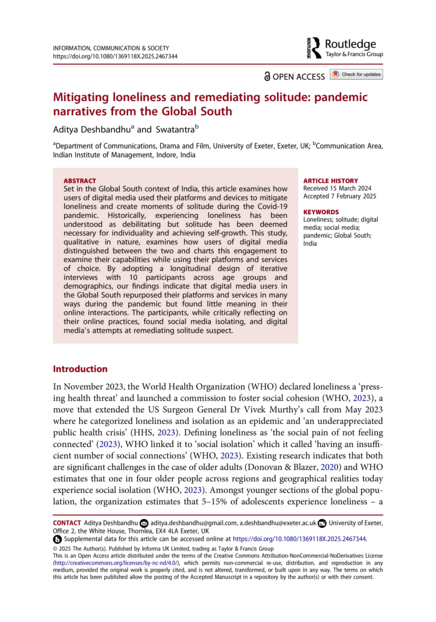 "Set in the Global South context of India, this article examines how users of digital media used their platforms and devices to mitigate loneliness and create moments of solitude during the Covid-19 pandemic. Historically, experiencing loneliness has been understood as debilitating but solitude has been deemed necessary for individuality and achieving self-growth. This study, qualitative in nature, examines how users of digital media distinguished between the two and charts this engagement to examine their capabilities while using their platforms and services of choice. By adopting a longitudinal design of iterative interviews with 10 participants across age groups and demographics, our findings indicate that digital media users in the Global South repurposed their platforms and services in many ways during the pandemic but found little meaning in their online interactions. The participants, while critically reflecting on their online practices, found social media isolating, and digital media’s attempts at remediating solitude suspect." (Abstract)
