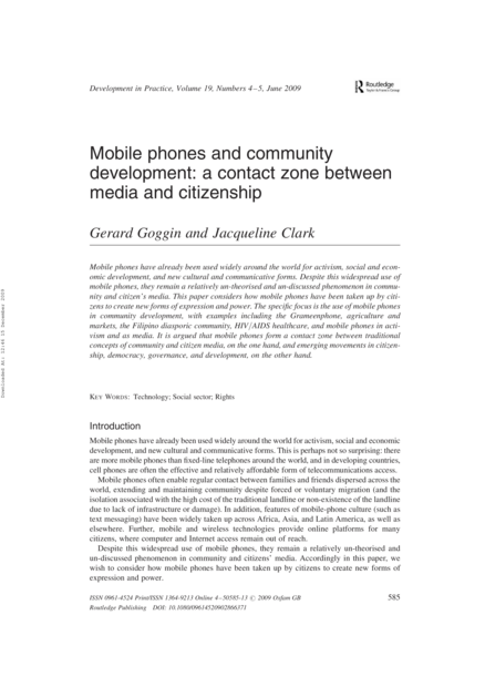 "Mobile phones have already been used widely around the world for activism, social and economic development, and new cultural and communicative forms. Despite this widespread use of mobile phones, they remain a relatively un-theorised and un-discussed phenomenon in community and citizen’s media. This paper considers how mobile phones have been taken up by citizens to create new forms of expression and power. The specific focus is the use of mobile phones in community development, with examples including the Grameenphone, agriculture and markets, the Filipino diasporic community, HIV/AIDS healthcare, and mobile phones in activism and as media. It is argued that mobile phones form a contact zone between traditional concepts of community and citizen media, on the one hand, and emerging movements in citizenship, democracy, governance, and development, on the other hand." (Abstract)
