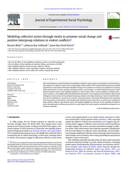"Does social influence exerted through role modeling of collective action impact social change in contexts that are not conducive to collective action, such as long-lasting violent conflicts? We examined this question in two field experiments in the Eastern Democratic Republic of Congo. We created two versions of an episode of an existing media intervention (a show aiming to promote positive social change), in which fictional characters either planned collective action (role modeling condition), or did not plan action (control condition) to address grievances. In Study 1, role modeling affected individual-level outcomes: it increased perceived collective efficacy and willingness to take action, but exacerbated intergroup attitudes and reduced tolerance. Study 2 tested the influence of role modeling on a group-level outcome (group discussions). Discussions following the role modeling show focused less on grievances, and included more positive lessons of the show, as well as more statements about collective efficacy and collective action. The findings highlight the influence of role modeling of collective action through media on efficacy and action for social change, but caution against unintended consequences on intergroup attitudes." (Abstract)