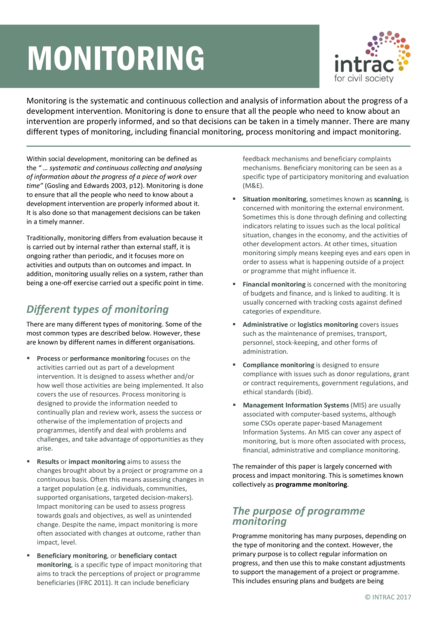 "Monitoring is the systematic and continuous collection and analysis of information about the progress of a development intervention. Monitoring is done to ensure that all the people who need to know about an intervention are properly informed, and so that decisions can be taken in a timely manner. There are many different types of monitoring, including financial monitoring, process monitoring and impact monitoring." (Introduction)