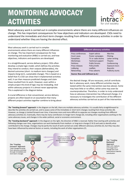 "Most advocacy work is carried out in complex environments where there are many different influences on change. This has important consequences for how objectives and indicators are developed. CSOs need to understand the immediate and short-term changes resulting from different advocacy activities in order to understand whether they are having the desired effect." (Introduction)